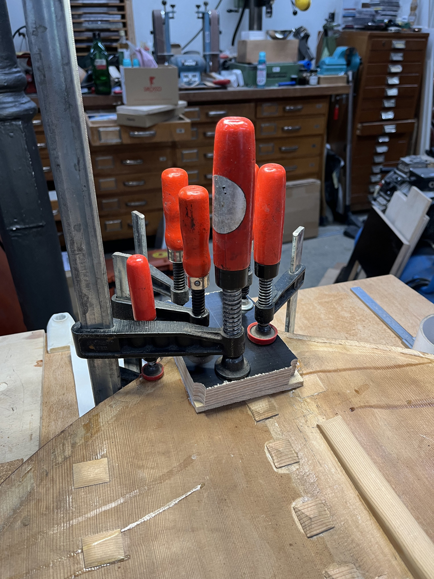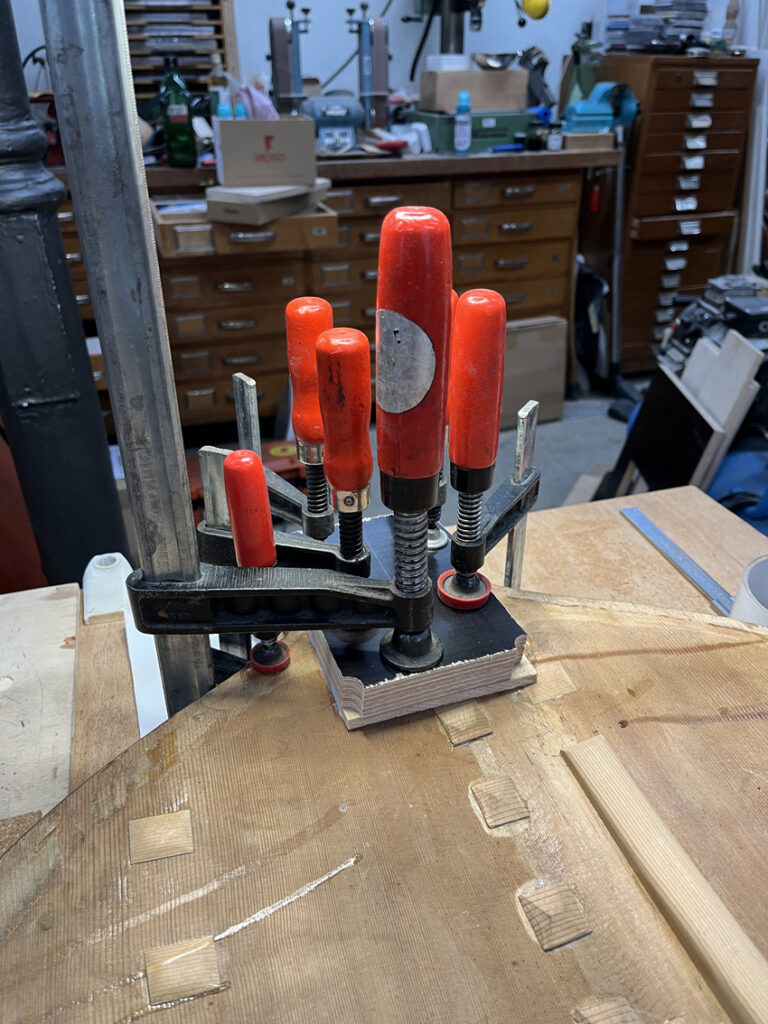 Vorsichtig in die fragile Decke einverleimt, tut man gut daran, auf gute Abstützung der schweren Zwingen zu achten, denn die vom Körper dess Basses abgelöste Decke ist wie Glas und bricht schnell. Schon am nächsten Tag, nach dem Wegnehmen der Zwingen, erfühlt man die neue Stabilität der Decke. Das überstehende Holz wegzustechen und den Einleimer auf die passende Dicke zu hobeln sind danach ein pures Vergnügen.